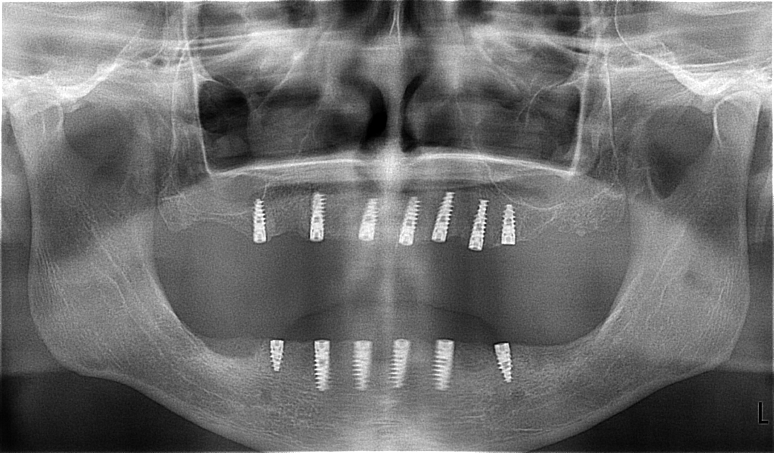 Пациент на 50 години с пародонтоза III-та степен. Зъбите не могат да бъдат възстановени и след обстоен преглед и разговор с пациента беше пристъпено към радикални мерки по възстановяване, максимално близки до естественото съзъбие. Бяха извадени всички зъби и поставени 13 импланта, един със закрит синус-лифт от д-р Трифонов. За да бъде по-поносим периодът за поставяне и остеоинтеграция на имплантите в костта (около 6 месеца) и за да може пациентът да се храни и функционира социално, бяха изработени 2 плакови протези от лаборатория.